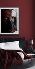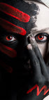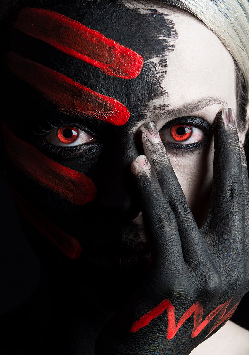Detta intensiva porträtt visar en kvinna med slående röda ögon och dramatisk kroppsmålning i eldfulla toner. Svarta och röda penseldrag över ansikte och händer framkallar eldens råa kraft, och förenar figurativ fotografi med symbolisk konst. Ett djärvt och fängslande konstverk som utstrålar passion, styrka och intensitet.
