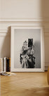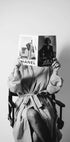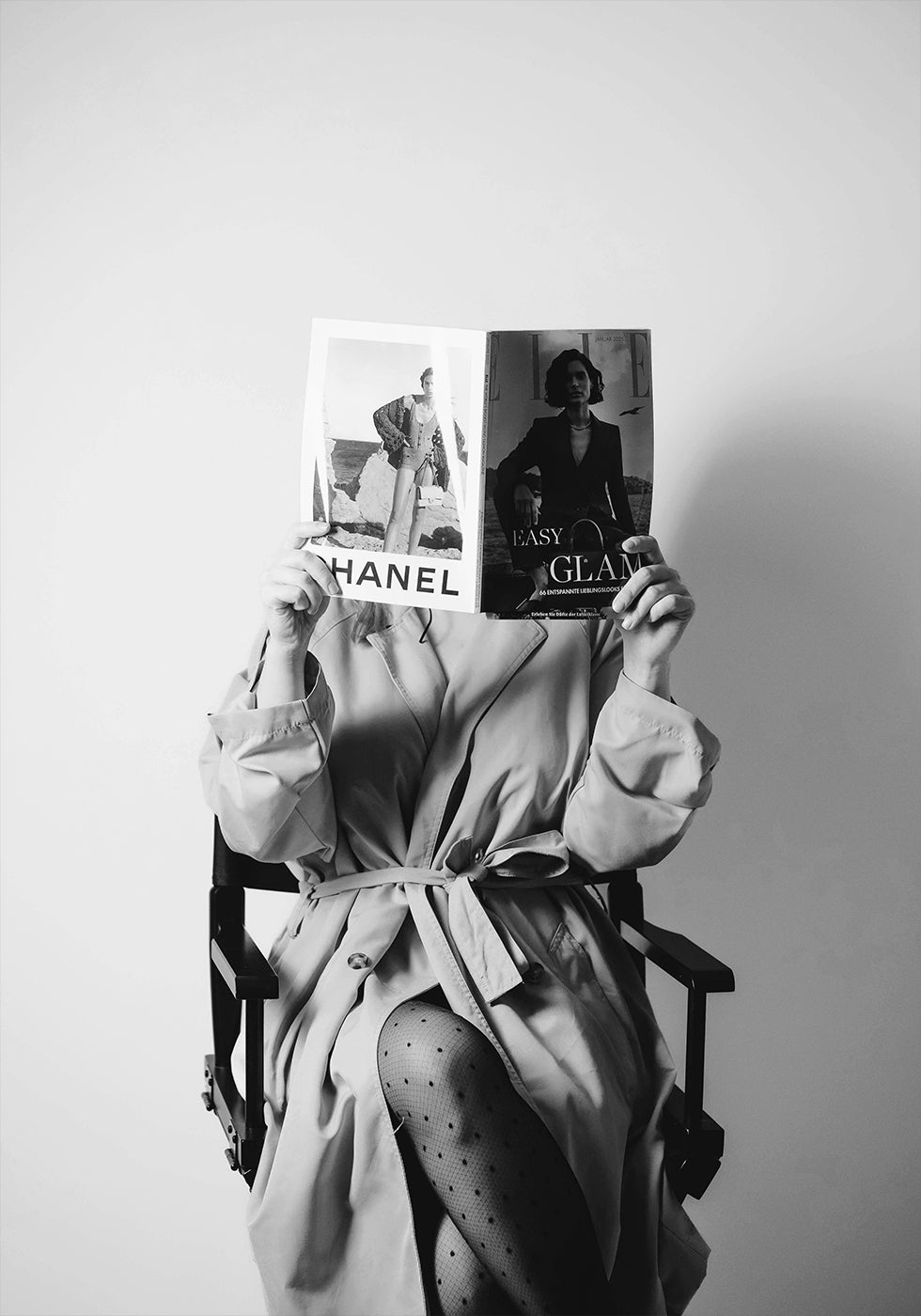 Ett sofistikerat svartvitt fotografi av en kvinna i trenchcoat och prickiga strumpbyxor, som håller upp modemagasin med Chanel och Elle. Konstverket speglar tidlös stil och parisisk elegans, idealiskt som ett statement i moderna, modeinspirerade interiörer.