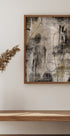Affischen visar en abstrakt komposition med en blandning av grå, beige och svarta toner. Dynamiska, böjda linjer och mjuka former skapar en känsla av rörelse och djup. De olika texturerna bidrar till en visuell komplexitet som får ögat att vandra över hela bilden. Den minimalistiska stilen skapar en modern och elegant atmosfär.