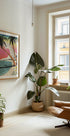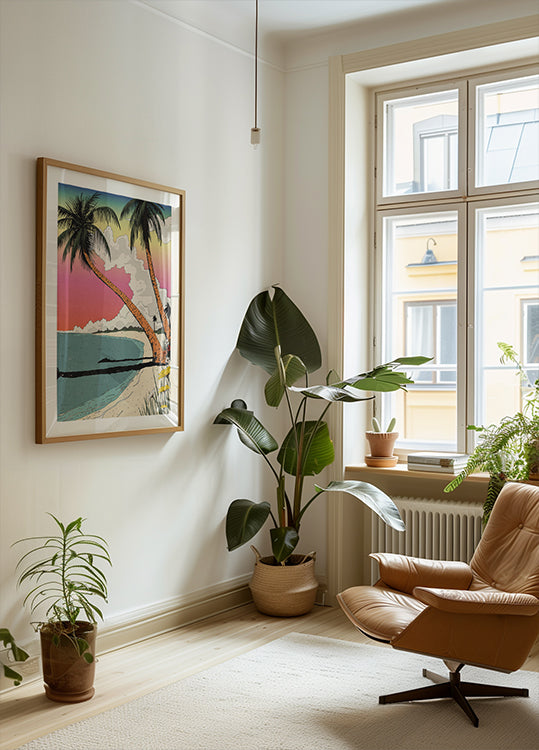 Pulsande tropiker möter retroresedröm: en solnedgång över Hawaiis turkosa vatten där palmerna siluetteras mot himlen och hibiskusblommor ramar in stranden. Waikikis ikoniska kust skymtar vid horisonten, med vulkaniska toppar i fjärran. Illustration av Nicholas med tidlös, mid‑century-känsla. En inbjudan till paradisets lugn och surfkultur.
