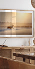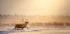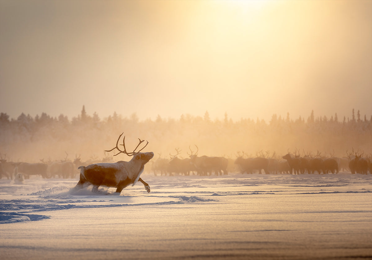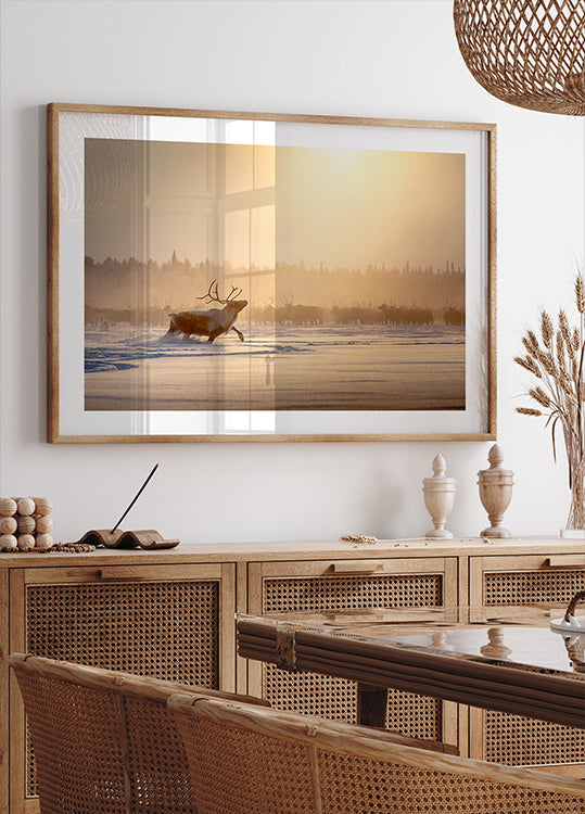 En ståtlig renalfahane träder fram ur ett snöklätt, frostigt landskap, hornen badande i ett varmt gyllene sken som kontrasterar mot den kalla vinterluften. I bakgrunden anar man flocken och stillheten. En stämningsfull vinterstudie av konstnären Patrik Minar – tidlös och kraftfull. Perfekt för jul och vintermys.