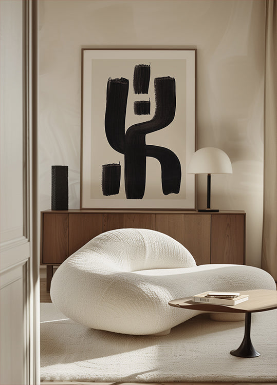 Ancient Sign av Ejaaz Haniff är en monokrom, grafisk komposition där djärva svarta former möter vit yta. Ett stiliserat tecken, som ett uråldrigt sigill, byggs upp av strikt geometri och balanserad symmetri. Minimalismen ger rummet ett lugnt fokus och en modern, tidlös karaktär. Perfekt för skandinavisk inredning och samtida väggar.
