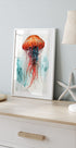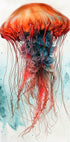 En fantastisk akvarellillustration av en manet, med eldig orange klocka och långa trådar som svävar graciöst i blå toner. Detta marina konstverk fångar undervattenslivets elegans med måleriska detaljer, och förenar konst och natur i en fängslande akvatisk scen.