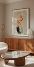 En modern abstrakt illustration av tropiska frukter som papaya, fikon och citrus, balanserade graciöst ovanför en stiliserad hand. Med jordnära toner och kraftiga konturer hyllar konstverket fräschhet, natur och vardagens färgstarka skönhet. Ett perfekt verk för kök och moderna interiörer.