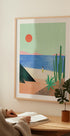 En stillsam kustillustration som visar en ensam figur som promenerar längs stranden under en stark sol. De mjuka pastelltonerna av sand, hav och växter skapar en minimalistisk men livfull sommarskänsla—perfekt för att ge en avslappnad och modern kustkänsla till alla rum.