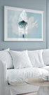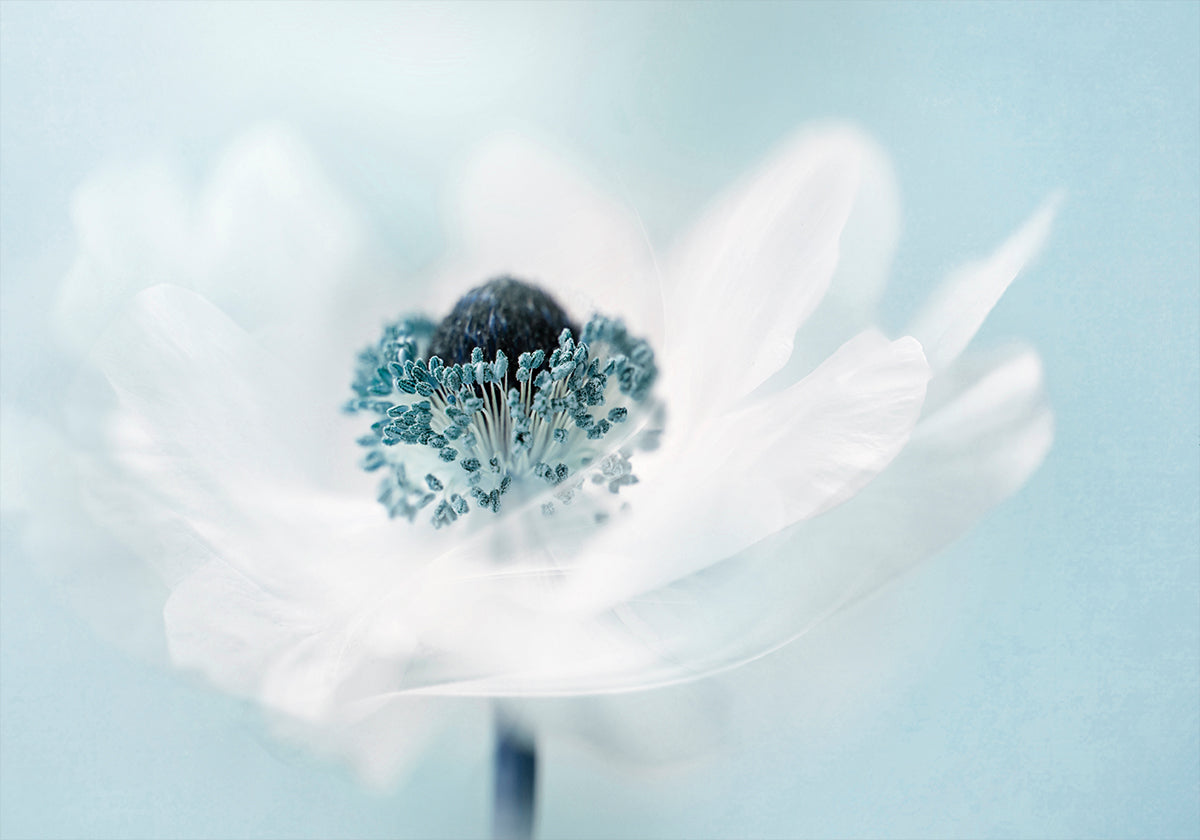 Ett delikat makrofotografi av en vit blomma med turkosa toner, vilket skapar en drömlik och eterisk atmosfär. Den mjuka fokuseringen och pastellfärgerna framkallar lugn och elegans, ett perfekt val för interiörer som söker harmoni och sofistikerad skönhet.