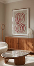 Crimson Echoforms av THE MIUUS STUDIO är en modern, abstrakt komposition med varma röda toner mot mjuka beige. Halvcirklar, rektanglar och eleganta linjer bildar ett harmoniskt stilleben med vas och skål. Subtila akvarelltexturer och retroinfluerad symmetri skapar ett stilrent, tidlöst uttryck. Perfekt för modern inredning.