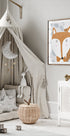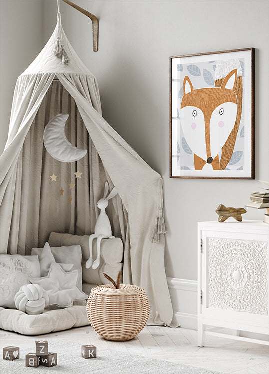En söt röd räv vilar bland grå blad och frostig snö i en stämningsfull, nordisk scen. Den varma tonen från pälsen kontrasterar mot de kyliga bladen och skapar lugn och lekfullhet på samma gång. Illustration av konstnären Carla Daly – perfekt för barnrum, nursery eller en mysig vägg hemma. Inspirerad av skogens stillhet och vinterkänsla.