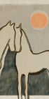 Equine Embrace av Treechild fångar hästens stilla rörelse i skymningsljus. En minimalistisk siluett i mjuka gröna toner och subtila geometriska former möter en varm solnedgång, vilket skapar ett lugnt, samtida uttryck. Perfekt som elegant blickfång i vardagsrum, hall eller barnrum. Ger väggarna ett stilla, modernistiskt lugn.