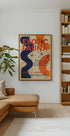 En retroinspirerad konstaffisch med stark typografi och abstrakta tropiska former i orange, marinblå och beige toner. Affischen har en vintage galleristil som tillför ett exotiskt och kreativt uttryck i hemmet. Perfekt för designälskare som uppskattar mid-century estetik.