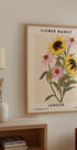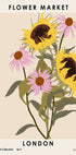 En charmig blomstermarknadsaffisch med gyllene solrosor och mjuka rosa blommor. Detta modern-vintageinspirerade konstverk hyllar Londons blomelegans och sommarens livfullhet.