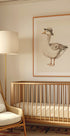 En gås i hatt? Självklart! Detta lekfulla porträtt i mjuka, neutrala nyanser ger ett humoristiskt men samtidigt stilrent uttryck – perfekt för barnrum, stugmiljö eller en charmig tavelvägg med personlig prägel.