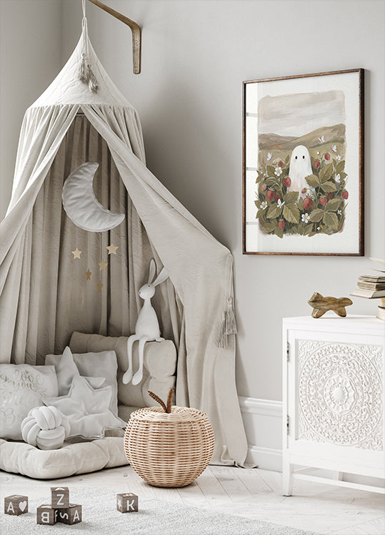 Ghost and Strawberries av Andreas Magnusson förenar det lekfulla och det gåtfulla: ett stilla spöke rör sig bland saftiga jordgubbar och skapar en oväntad, poetisk kontrast. En bild som lockar till leenden och eftertanke, perfekt för att ge rummet en dos charm, värme och mild mystik. Passar lika bra i köket som i hallen.