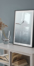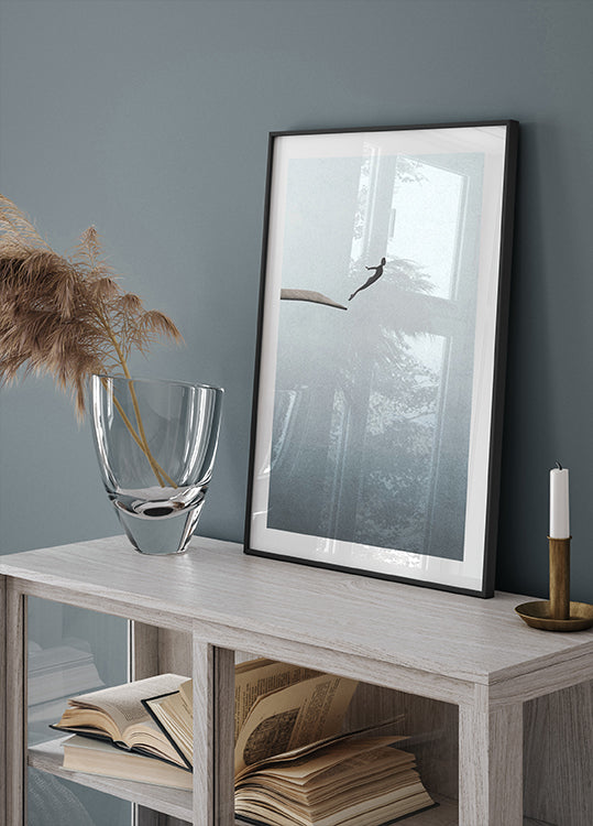 En avskalad och poetisk bild av en ensam figur som kastar sig ut i det okända. Symboliserar modet att ta steg utan säkerhet – en kraftfull tolkning av förändring, inre styrka och livsval.