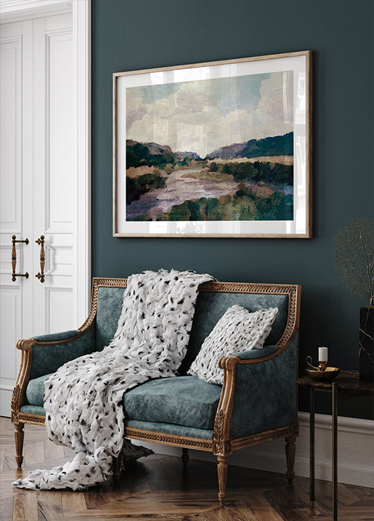 Kernow Stream av Dan Hobday fångar en stillsam, abstrakt landskapsscen där en slingrande bäck leder blicken genom stiliserade former och subtila penseldrag. Kompositionens luft och rytm skapar ett lugn med antydan till nostalgi – ett modernt, minimalistiskt uttryck för naturens rörelse. Perfekt som lugn blickpunkt i samtida inredningar.