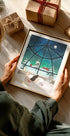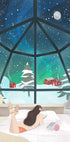 En stämningsfull illustration av Petra Lizde som fångar Lapplands vintermagi: norrskenet dansar över snötäckta granar och en liten stuga. Inne i värmen läser en ung kvinna med hörlurar, katten kurar vid fotänden. En drömsk scen där tystnad, stjärnhimmel och nordligt ljus skapar ro. Perfekt för att väcka julstämning och resedrömmar norrut.