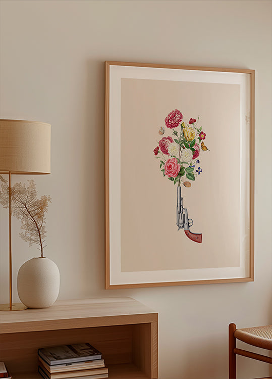 Love, Not War av CATS AND DOTZ är en poetisk protestbild: en pistol som förvandlas till en kaskad av blommor. Den skarpa kontrasten mellan vapen och floralt liv skapar ett starkt visuellt manifest för fred, hopp och förvandling. En modern symbol för mjuk motståndskraft och kärlekens seger över våld.