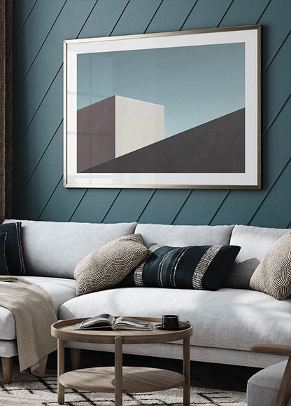 Ett lugnt och elegant motiv av modernistisk byggnadsform – betongblock i geometrisk komposition mot en blekblå himmel. Perfekt för modern inredning och älskare av minimalistisk estetik.