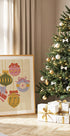 En charmig julillustration av Nikita Jariwala: färgglada ornament, glimmande kulor och lekfulla rosetter hänger mot en mjuk vinterbakgrund. Retroinspirerade former, rena linjer och varm palett framkallar nostalgisk holiday-känsla. Perfekt för att lyfta hall, vardagsrum eller barnrum. Ger en varm hälsning med Merry Christmas-känsla.