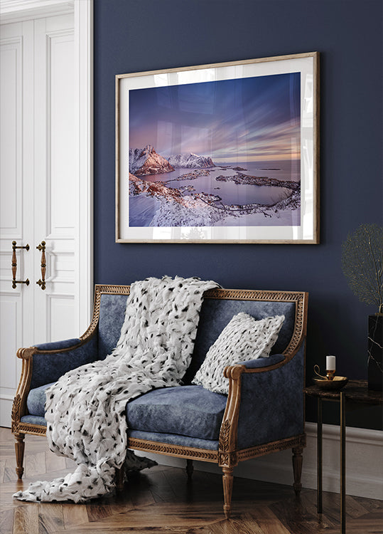 Purple Haze fångar Lofotens dramatiska vinterlandskap vid solnedgången: snötäckta bergskammar reser sig över fjordens spegel och havets milda dyning, medan purpurtonade strålar bryter genom molnen. Fotot av Rafal R. Nebelski ger en tidlös vy från Reinebringen med djup, stillhet och subtil rörelse.