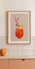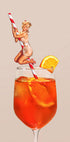En retroinspirerad collageaffisch som fångar sommarens bubbliga energi: ett glittrande spritz-glas med is och apelsinskiva, stänk och solkysst sken, sida vid sida med en elegant pinup i 60-talsstil. Känslan är strandklubb och disco i beige och orange – perfekt för barvagn, kök eller vardagsrum.