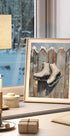 Schlittschuhe am Zaun av Ohkimiko fångar vinternostalgi i ett stilla ögonblick: ett par välanvända skridskor hänger på en väderbiten trästaketspjäla, snön faller mjukt och luften doftar av is och förväntan. En stämningsfull detalj i hemmet som väcker minnen av skratt, spår på isen och julens lugna skimmer.