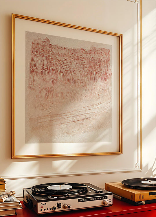 Ett abstrakt konstverk i mjuka, jordnära toner av beige och rödockra. De vertikala, rytmiska linjerna i den övre delen skapar en känsla av struktur och rörelse, nästan som spår i sand eller organiska mönster. Den nedre delen är ljusare och mer utsuddad, med subtila sprickor och skiftningar som ger en känsla av naturligt slitage och textur. Helheten känns stillsam, varm och meditativ – som ett möte mellan naturens mönster och en väderbiten yta.