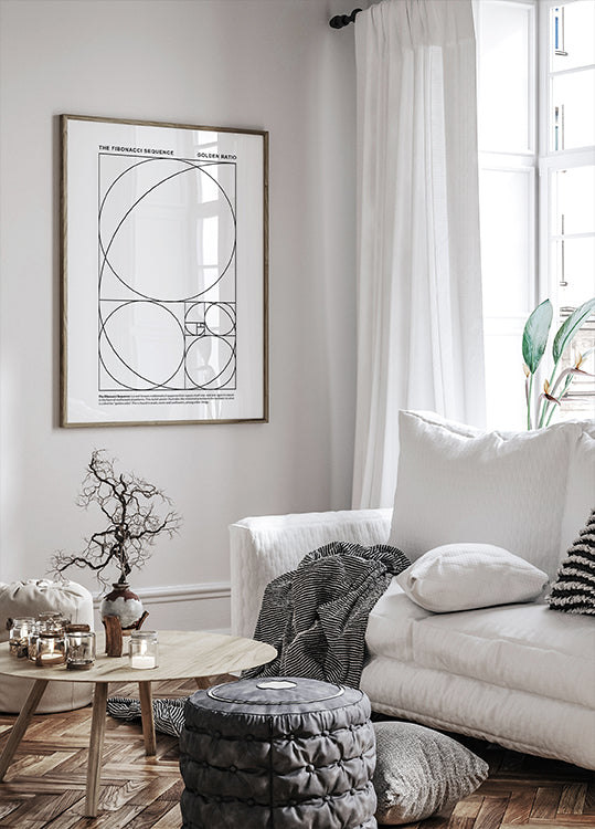 En minimalistisk matematisk poster som illustrerar Fibonacci-sekvensen och det gyllene snittet. Denna eleganta design visar det geometriska sambandet som återfinns i naturen, konsten och arkitekturen. Perfekt för matematikälskare, studenter och modern inredning.