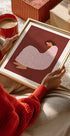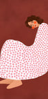 Ett mjukt och lekfullt illustrerat motiv av en kvinna som är svept i ett stort, vitrosa mönstrat täcke. Hon sitter med benen indragna och blicken riktad mot betraktaren. Den varma, röda bakgrunden förstärker känslan av stillhet, omtanke och trygghet.