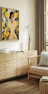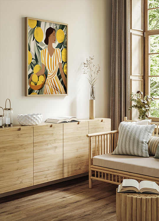 En färgstark och stilfull illustration av en kvinna i en gulrandig klänning omgiven av frodiga citronträd. Med en skål färska citroner i handen förmedlar hon somrig värme och medelhavskänsla. Verkets mjuka toner och eleganta uttryck gör det perfekt för modern inredning.