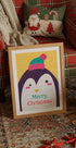 En lekfull vinterhälsning: en söt pingvin i mössa och halsduk hälsar från ett snötäckt landskap, med glittrande snöflingor och festliga färger. Den moderna, färgstarka illustrationen av Marika Barsrsind sprider julglädje, värme och humor – perfekt för att lysa upp hemmet hela säsongen och sprida vintermagi i varje rum.